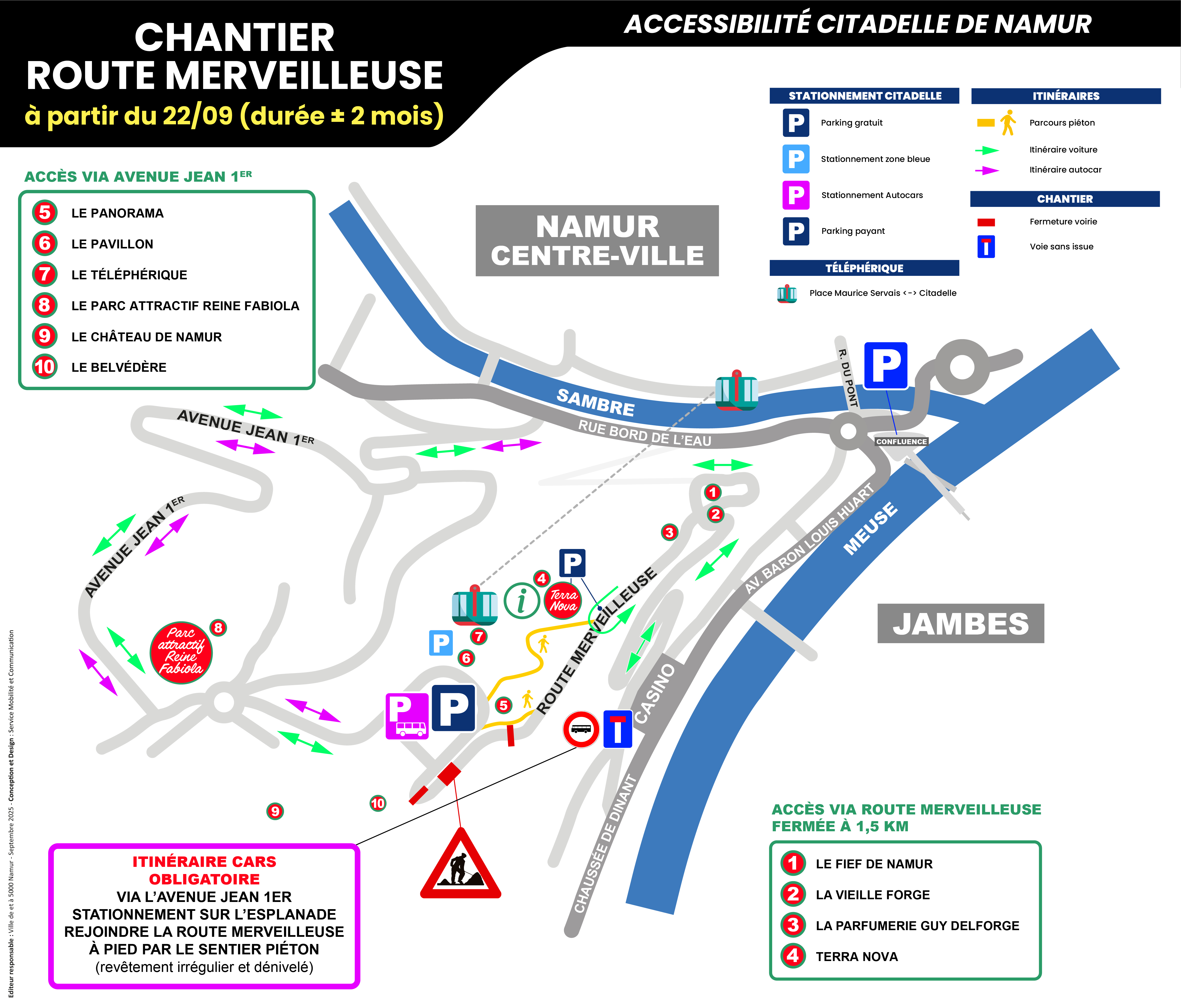 Bonne nouvelle : l’accès à Terra Nova, à la Parfumerie Guy Delforge, à la vieille forge et au Fièf de Namur reste possible via la Route Merveilleuse côté Casino (Meuse).